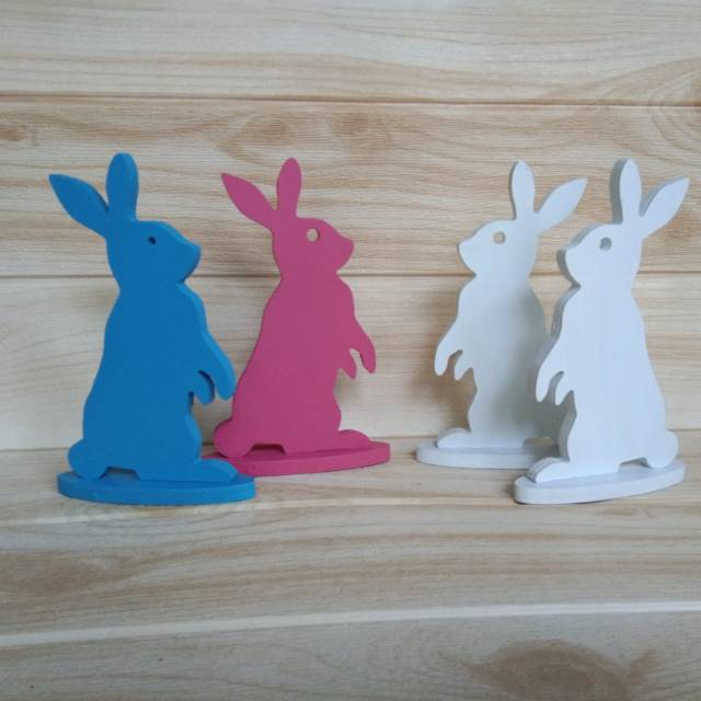 Hiasan Kayu Kelinci 18,5 x 12 cmBahan: kayu mdf.Ukuran: 18,5 x 12 cm.Warna: putih, biru,