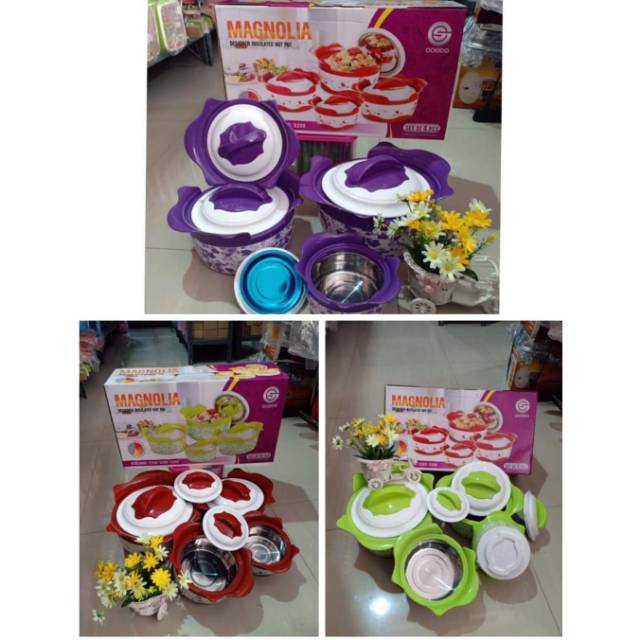 Food Warmer MagnoliaBagian dalam terbuat dari stainless yg cocok untuk menjaga makanan agar tetap panas/hangat. Bagian luar terbuat dari bahan plastik tebal berkualitas dengan desain yg cantik. Tersedia berbagai ukuran dalam satu set; 13cm, 16cm, 20cm, 23cm. Ready warna merah, ungu, hi