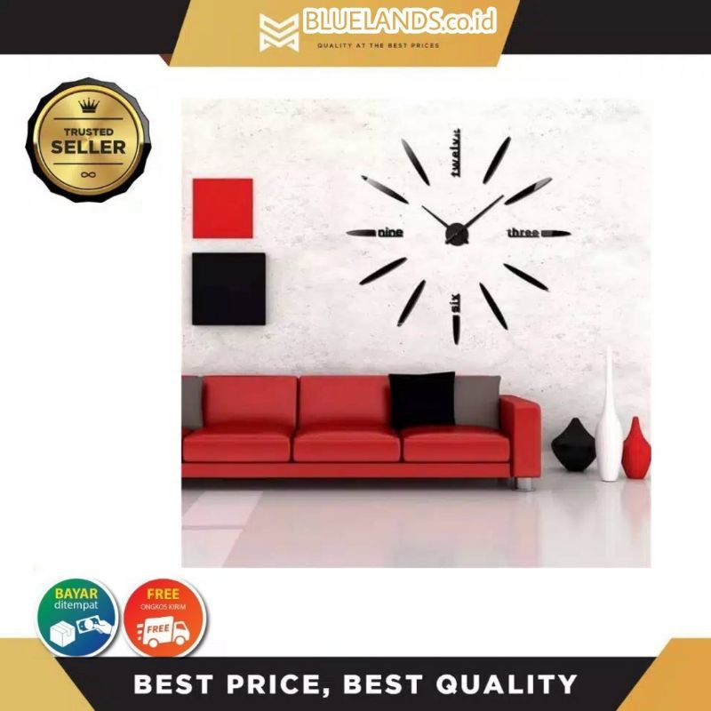 Warna : HitamJam dinding dengan ukuran sangat besar. Angka jam dan jarum jam dipasang secara manual. Jam ini memiliki diameter yang sangat besar yaitu antar 80 - 130 cm. Cocok diletak pada ruang tamu dan berfungsi sebagai penghias ruangan.Meskipun memiliki bentuk yang sangat besar namun jam ini tidak menghasilkan suara sama sekali. Tidak perlu cemas malam Anda menjadi ribut karena gerakan jam.Memiliki lapisan khusus untuk melindungi jam dari air dan uap. Jam ini akan awet dan tahan lama tanpa perlu perawatan rutin.Gaint wall clock ditenagai hanya dengan baterai AA.Angka pada jam dapat ditempel sesuai keinginan