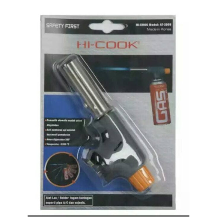 HI COOK ALAT LAS AT 2009 MADE IN KOREAApi fokus mencapai suhu 1300 derajat celciusAnti semburan api setelah 2 menit, sehingga penggunaan pada posisi terbalik tidak akan terjadi semburan api keluarPemantik otomatis yang menyatu dengan produk sehingga untuk menyalakan lebih mudah dan praktisDapat dipasang dengan mudah pada tabung gas cartridgeDigunakan untuk mengelas logam kuningan/ logam campuran kuninganSpesifikasi teknis:Model : AT-2009Dimensi (mm) : 200 x 40 x 95Berat : 129 gramPemantik : ManualBahan bakar : L.P GasKonsumsi gas : 80 gram/jam barang tersedia boss , langsung dipesan , akan segera kami p