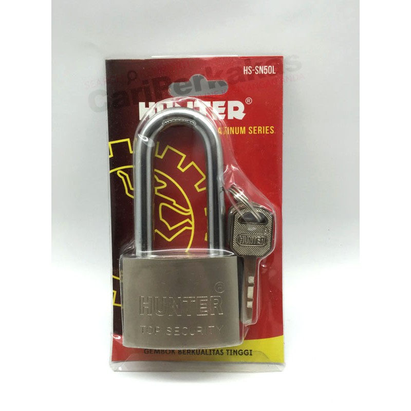 Gembok besi chrome HUNTER ukuran 50 mm leher panjang. Anak kunci da