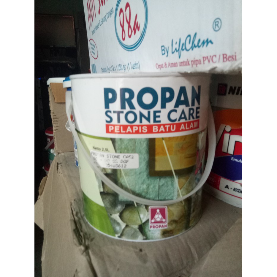Propan Stone Care Batu Alam Ready Stok Warna Gloss dan Doff. Pengiriman Jabodetabek only via Grab atau Gojek.PROPAN STONE CARE adalah pelapis batu alam yang terbuat dari bahan acrylic solvent based. PROPAN STONE CARE memberi perlindungan pada batu alam serta menonjolkan keindahan corak batu alam sehingga menjadi lebih artistik.Tersedia 2 (dua) pilihan :PROPAN STONE CARE SC 50 SB (tampilan gloss/kilap)PROPAN STONE CARE SC 80 SB (tampilan doff)Keunggulan:Anti lumut dan jamur (algae and fungus resistant)Tahan cuaca (Weather resistant)Menolak air (Water repel