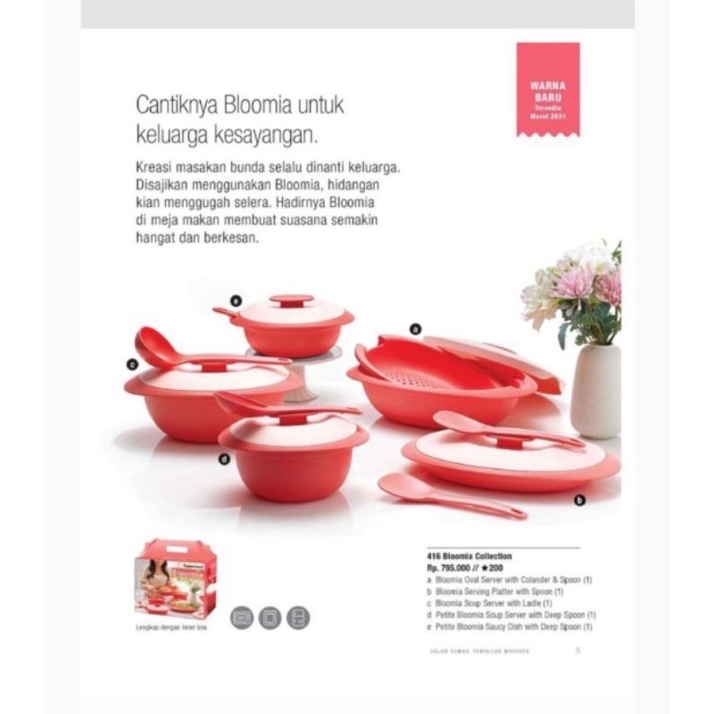 Rincian produk :1pcs soup server uk.1.8L//28*20.6*11.7cm1pcs petite suacy uk.800//19*21.2*6.7cm1pcs oval server uk.1.8L//32.3*20.5*10.3cm1pcs serving platter uk.600ml//32.3*20.6*6.5cm1pcs petite soup server uk.1.2L//19*21.2*9cmINNER BOX2300gr Terdiri dari:a. Blossom Oval Server with Colander & Spoon (1)b. Blossom Serving Platter with Spoon (1)c. Blossom Soup Server with Ladle (1)d. Blossom Saucy Dish with Spoon (1)e. Free:- Blossom Bowl (2)- Booklet & Gift box + packing k