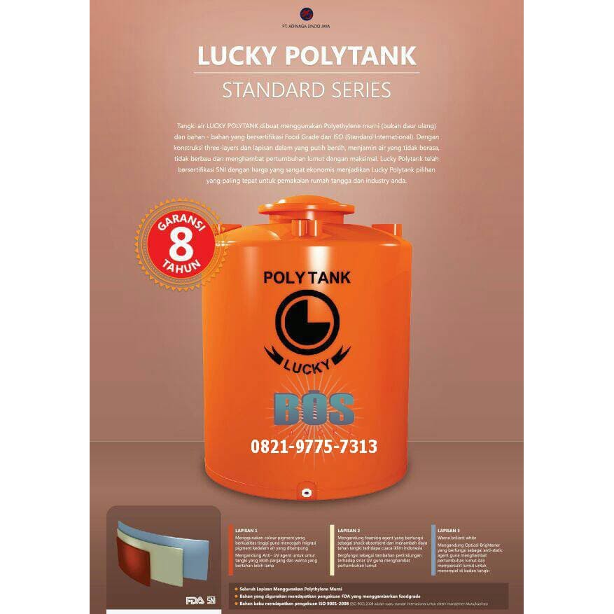 Volume : 1000 LiterDiameter tangki : 106,5 CMTinggi tangki : 136 CMGaransi 8 TAHUNLUCKY POLYTANK STANDART SERIESTangki air Lucky Polytank Dibuat menggunakan Polyethylene murni ( buka daur ulang ) dan bahan2 yg bersetifikasi food grade dan ISO (Standart International ) Dengan Konstruksi Three-layers dan lapisan dalam yang putih bersih ,menjamin air yg tidak berasa , tidak berbau dan menghambat pertumbuhan lumut dengan maksimal.Lucky Polytank telah bersertifikat SNI dengan harga yang sangat ekonomis menjadikan LUCKY Polytank pilihan yang paling tepat untuk pemakaian rumah tangga dan industry